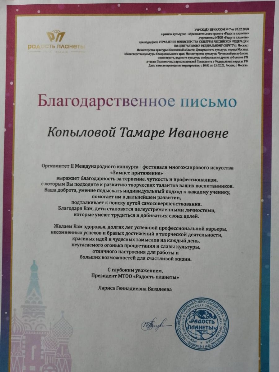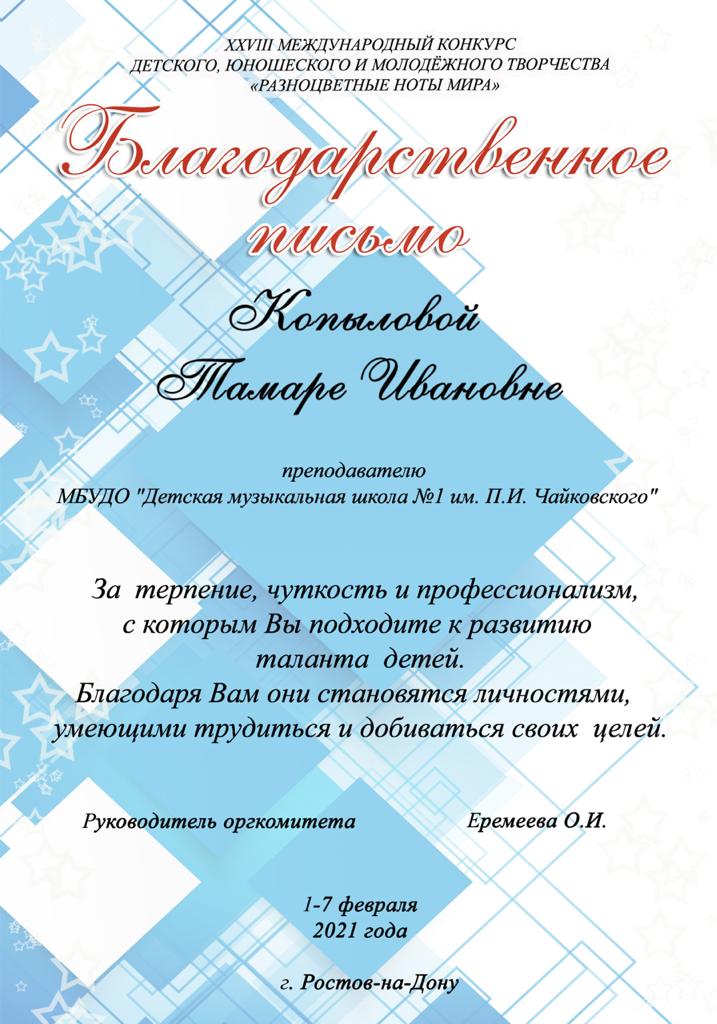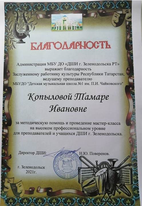 ДШИ г.Зеленодольска - Благодарность Копыловой Т.И.;