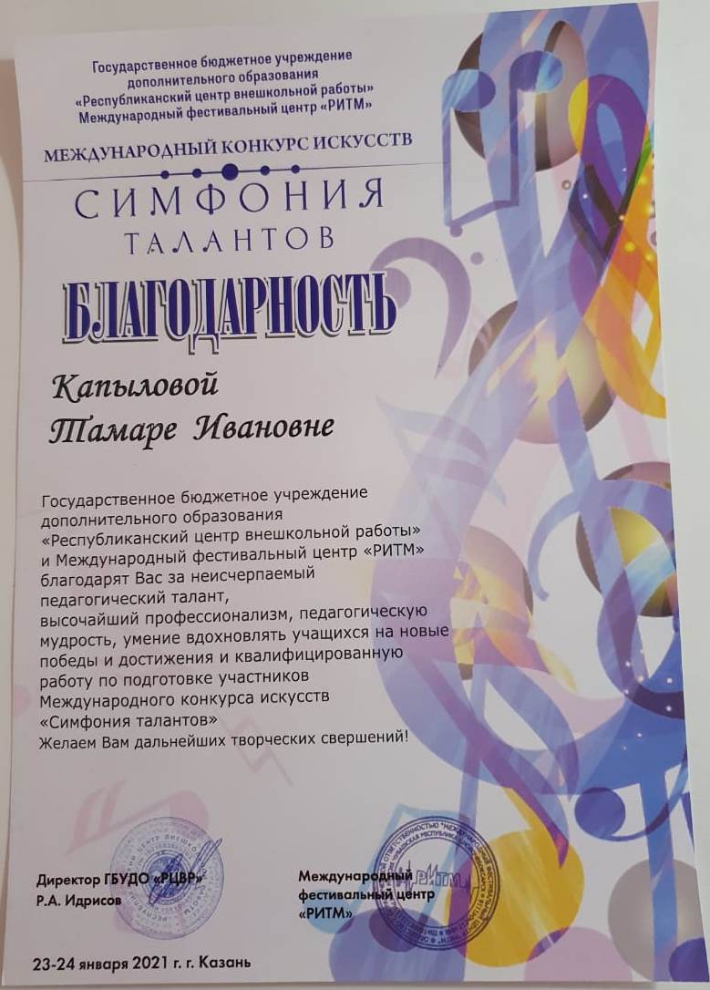 Международный конкурс искусств "Симфония талантов" - Благодарность Копыловой Т.И.;
