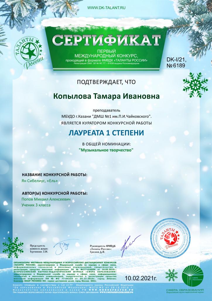 Первый международный конкурс "Таланты России" - Сертификат Копыловой Т.И.;