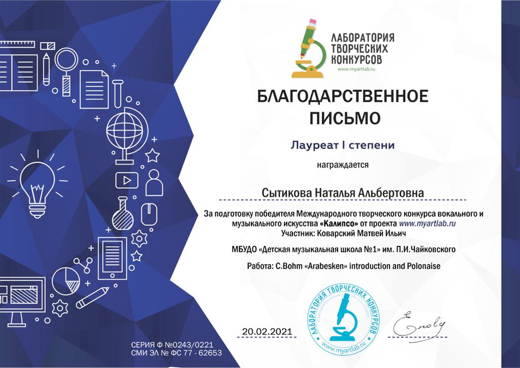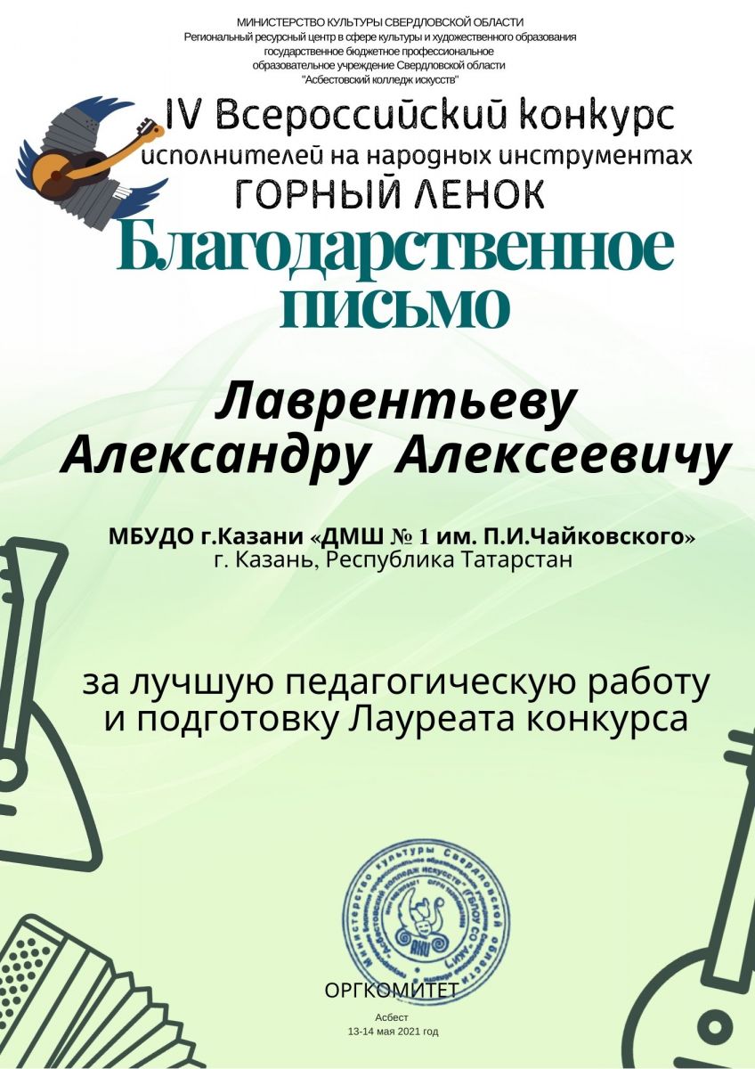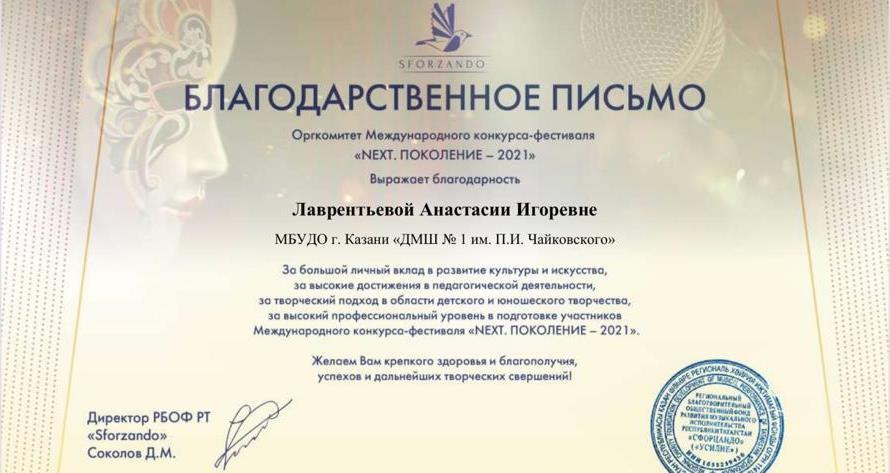 Международный конкурс-фестиваль "NEXT. Поколение - 2021" - Благодарность Лаврентьевой А.И.;