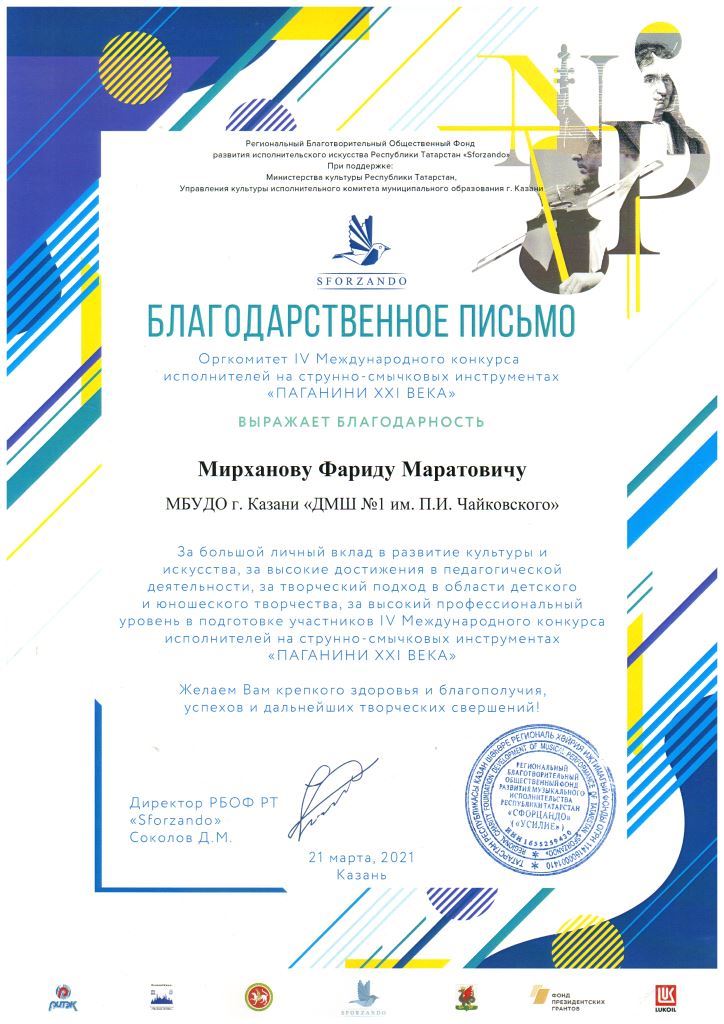 Международный конкурс-фестиваль "Будущее России" - Благодарность Мирханову Ф.М.;