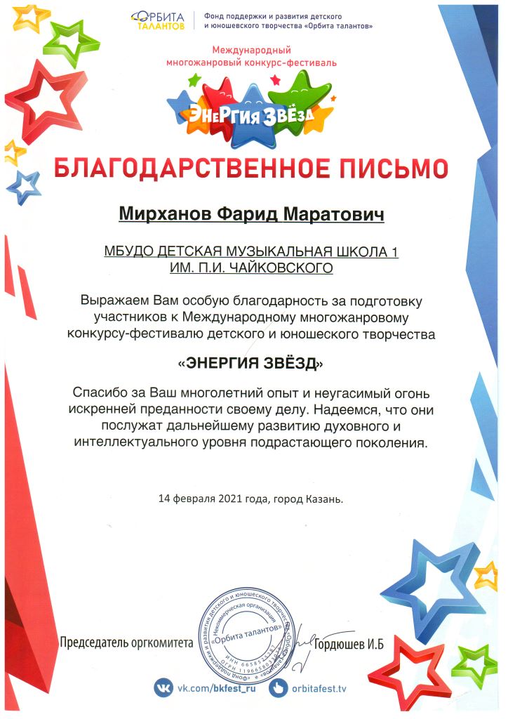 Международный многожанровый конкурс-фестиваль "Энергия звёзд" - Благодарность Мирханову Ф.М.;