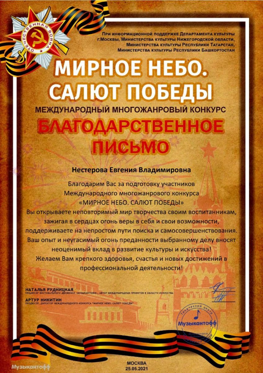 Международный многожанровый конкурс "Мирное небо. Салют Победы" - Благодарность Нестеровой Е.В.;