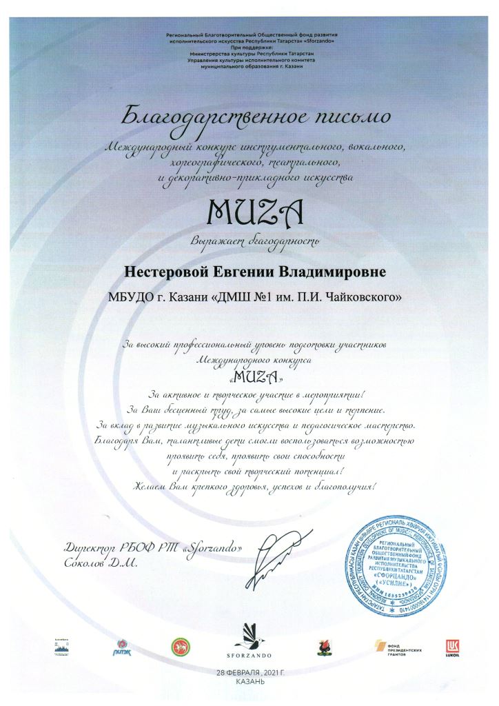 Международный конкурс инструментального искусства "Muza" - Благодарность Нестеровой Е.В..;