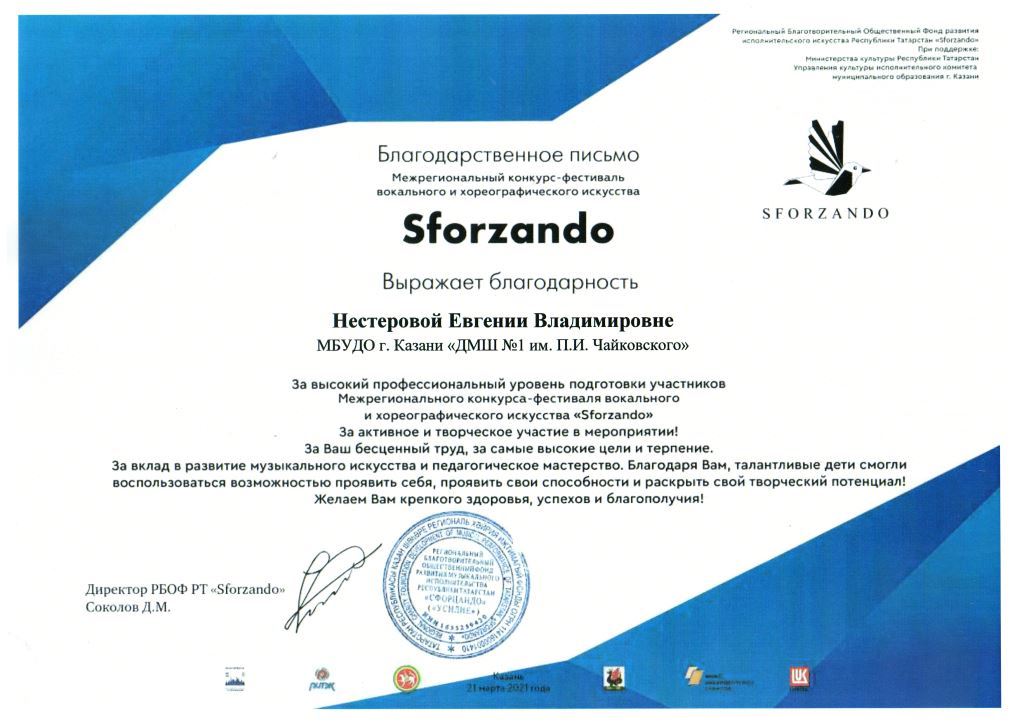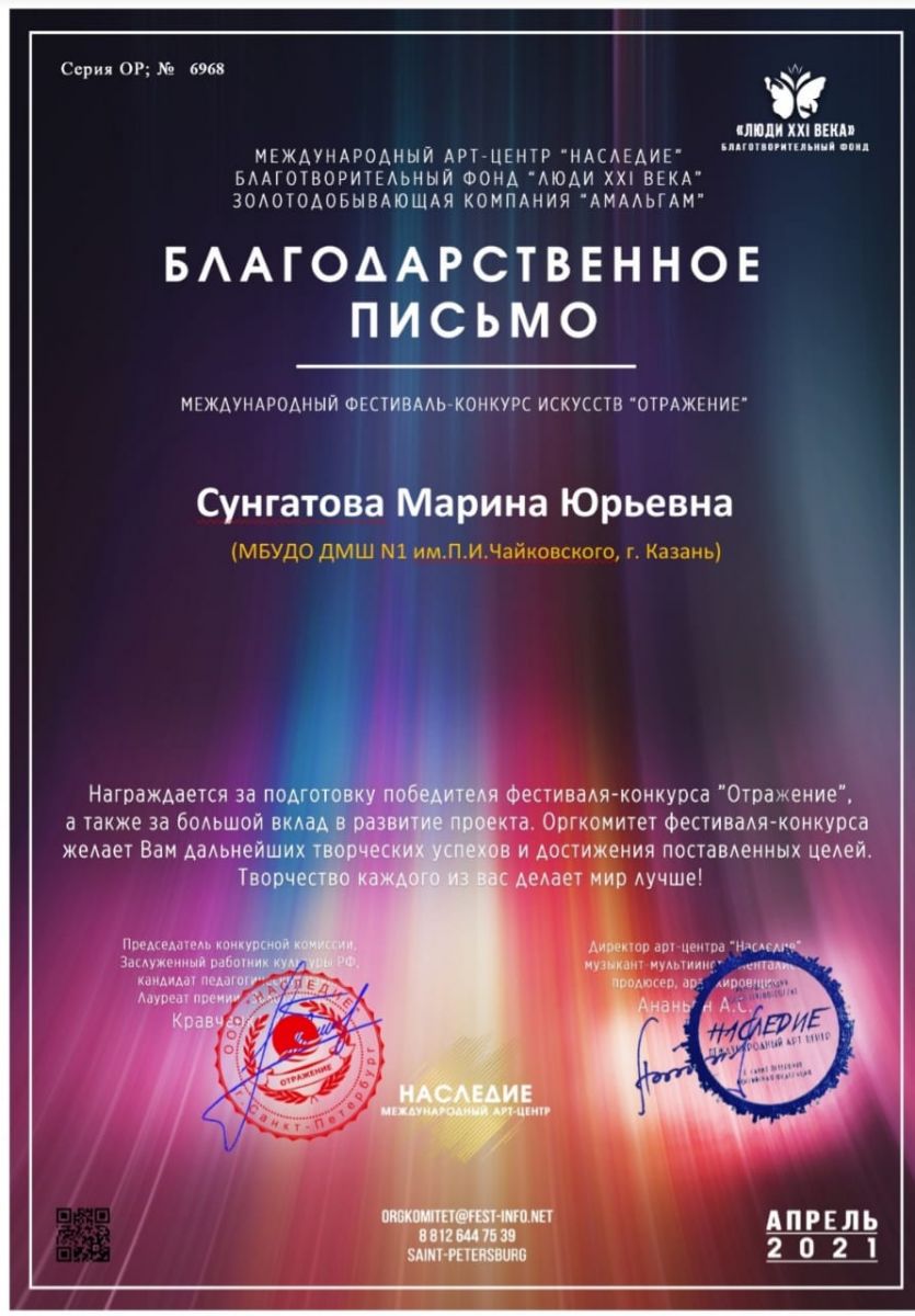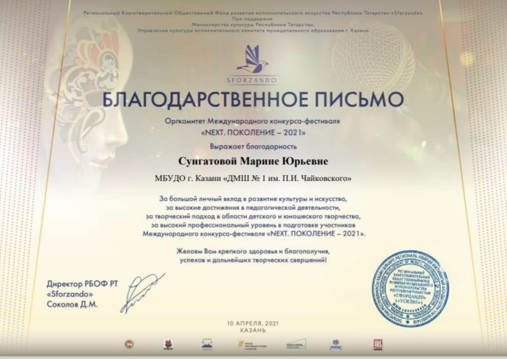 Международный конкурс-фестиваль "NEXT. Поколение - 2021" - Благодарность Сунгатовой М.Ю.;