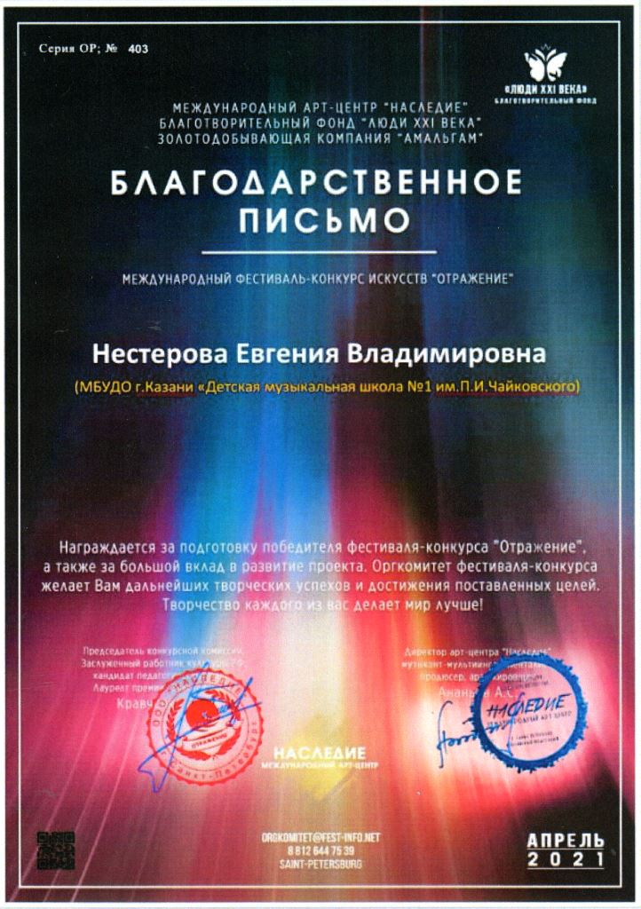 Международный фестиваль-конкурс искусств "Отражение" - Благодарность Нестеровой Е.В.;
