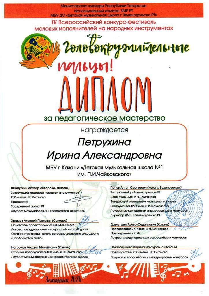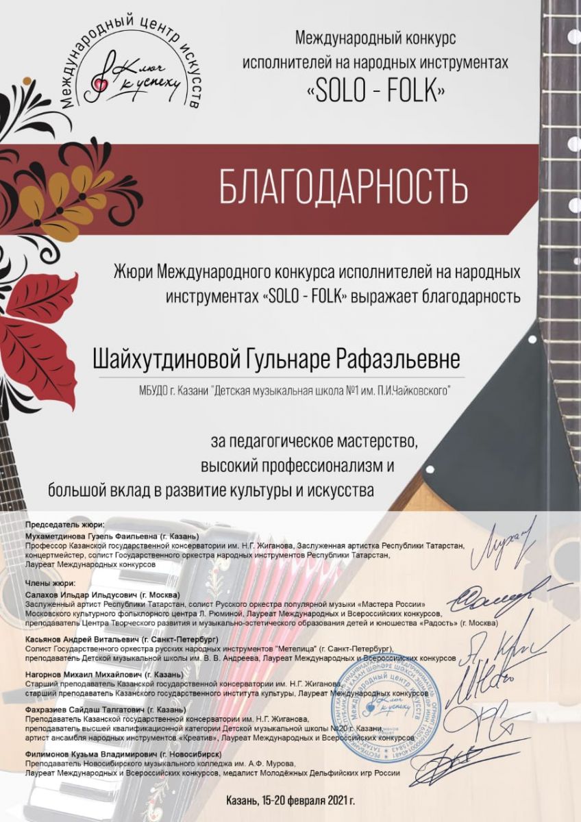 IV Всероссийский конкурс-фестиваль молодых исполнителей на народных инструментах "Головокружительные пальцы" - Благодарность Шайхутдиновой Г.Р.;