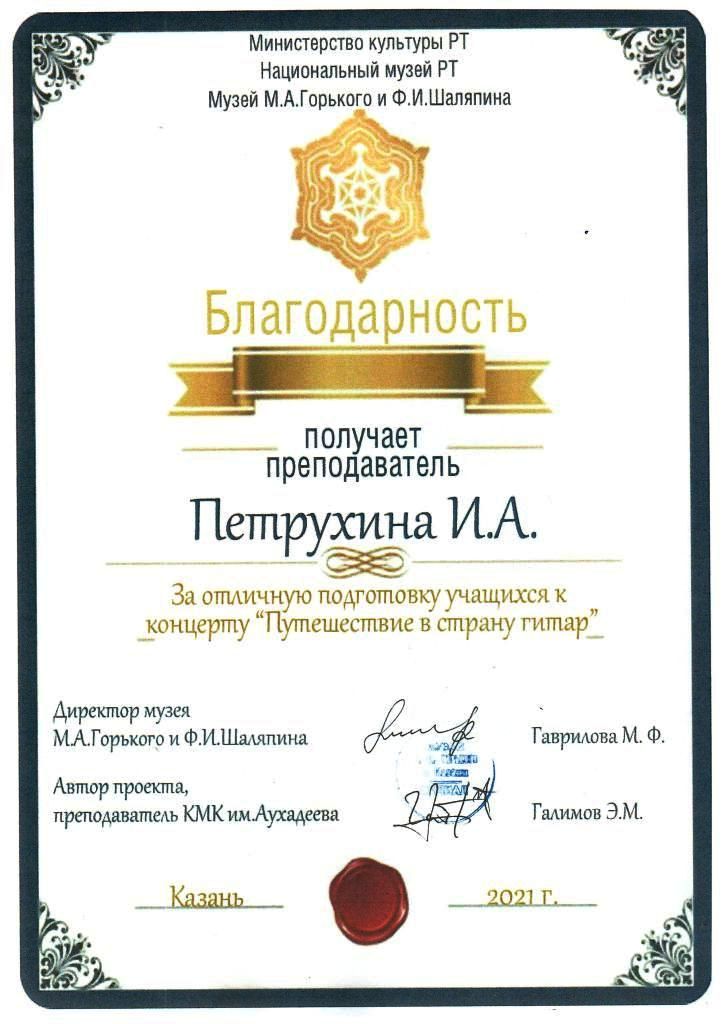 Городской концерт "Путешествие в страну гитар" - Благодарность Петрухиной И.А.;
