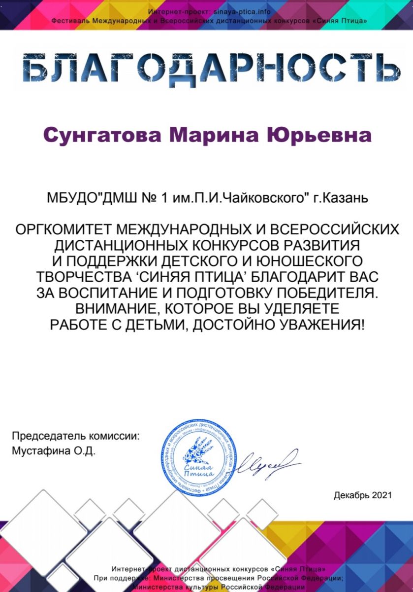 Международный конкурс "Синяя птица" - Благодарность Сунгатовой М.Ю.;
