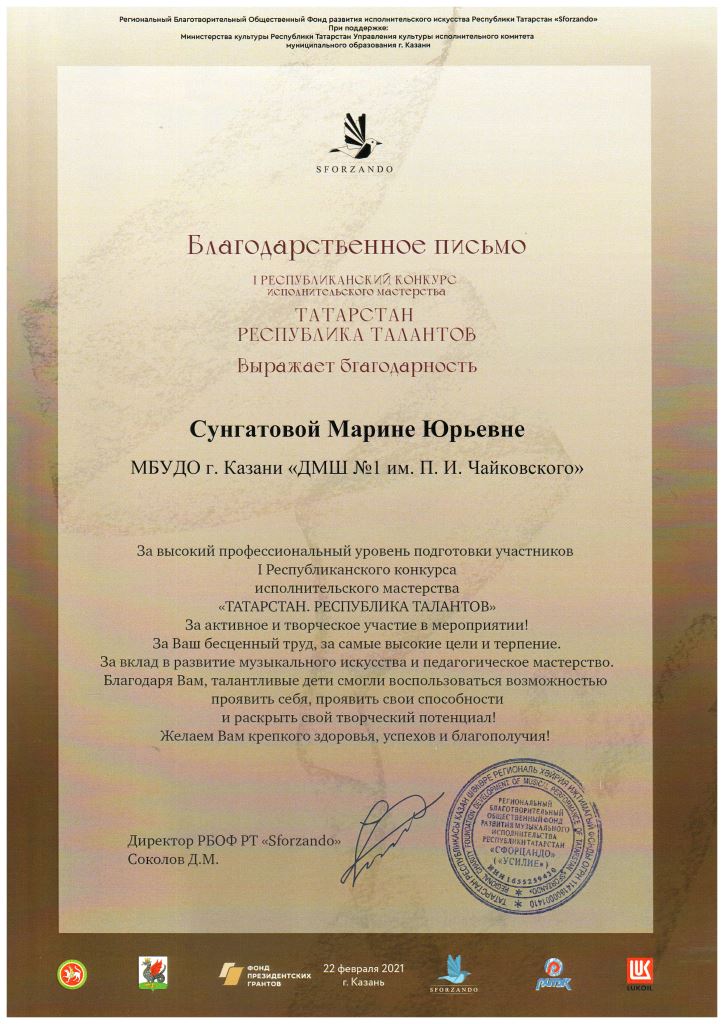 IV Международный конкурс пианистов "Моцарт XXI века" - Благодарность Сунгатовой М.Ю.;