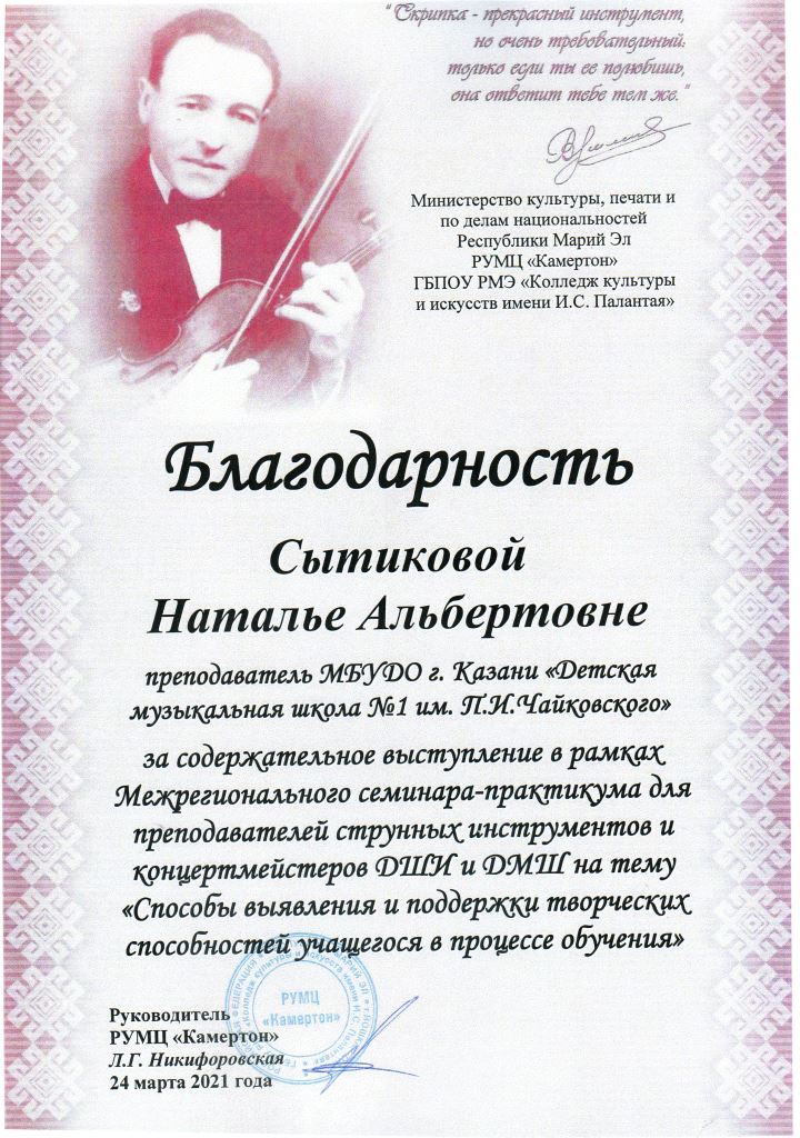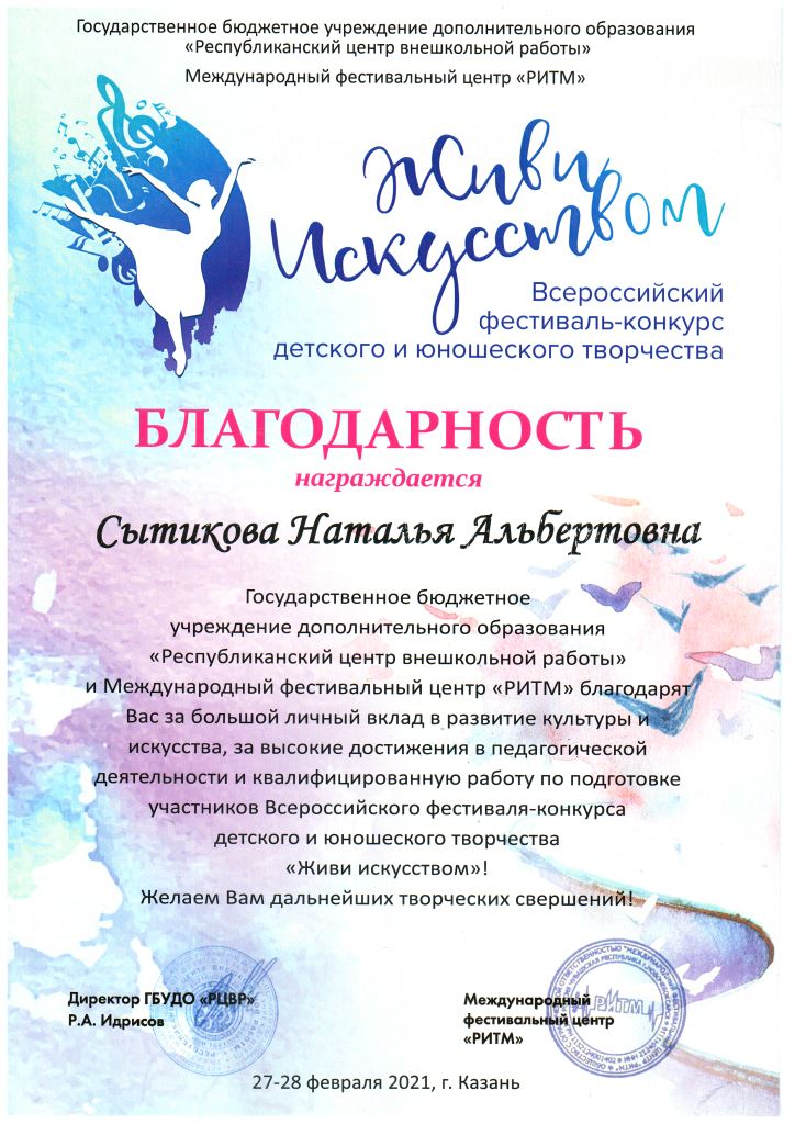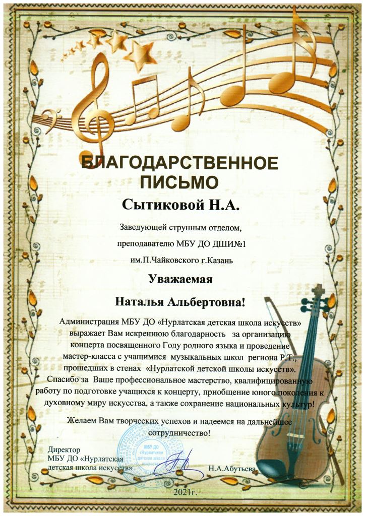Администрация МБУДО "Нурлатская детская школа искусств" - Благодарность Сытиковой Н.А.;