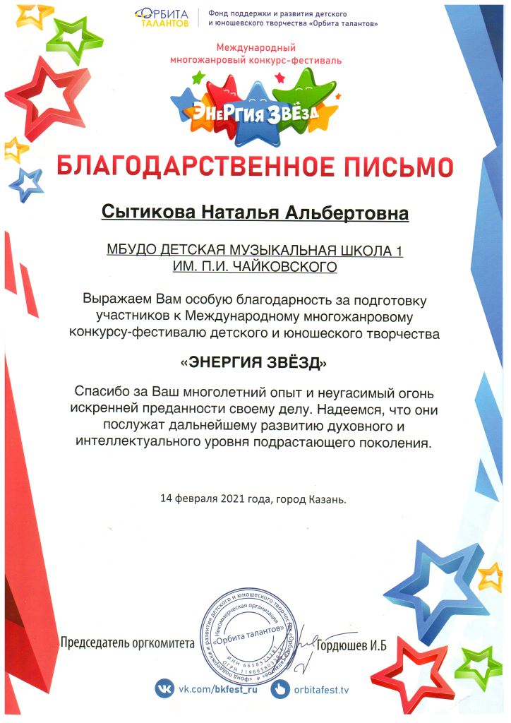 Международный многожанровый конкурс-фестиваль "Энергия звёзд" - Благодарность Сытиковой Н.А.;