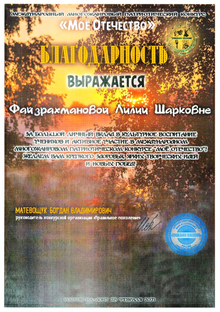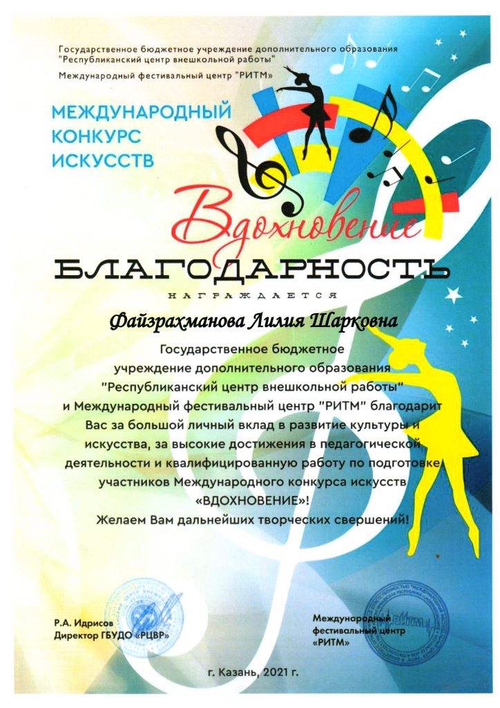 Международный конкурс искусств "Вдохновение" - Благодарность Файзрахмановой Л.Ш.;