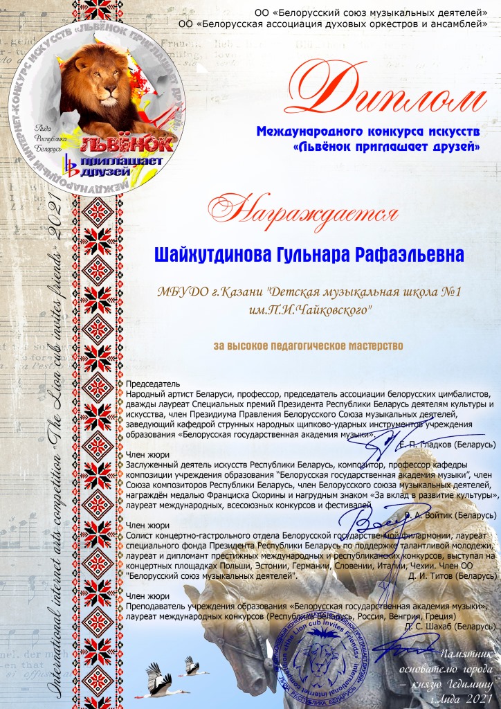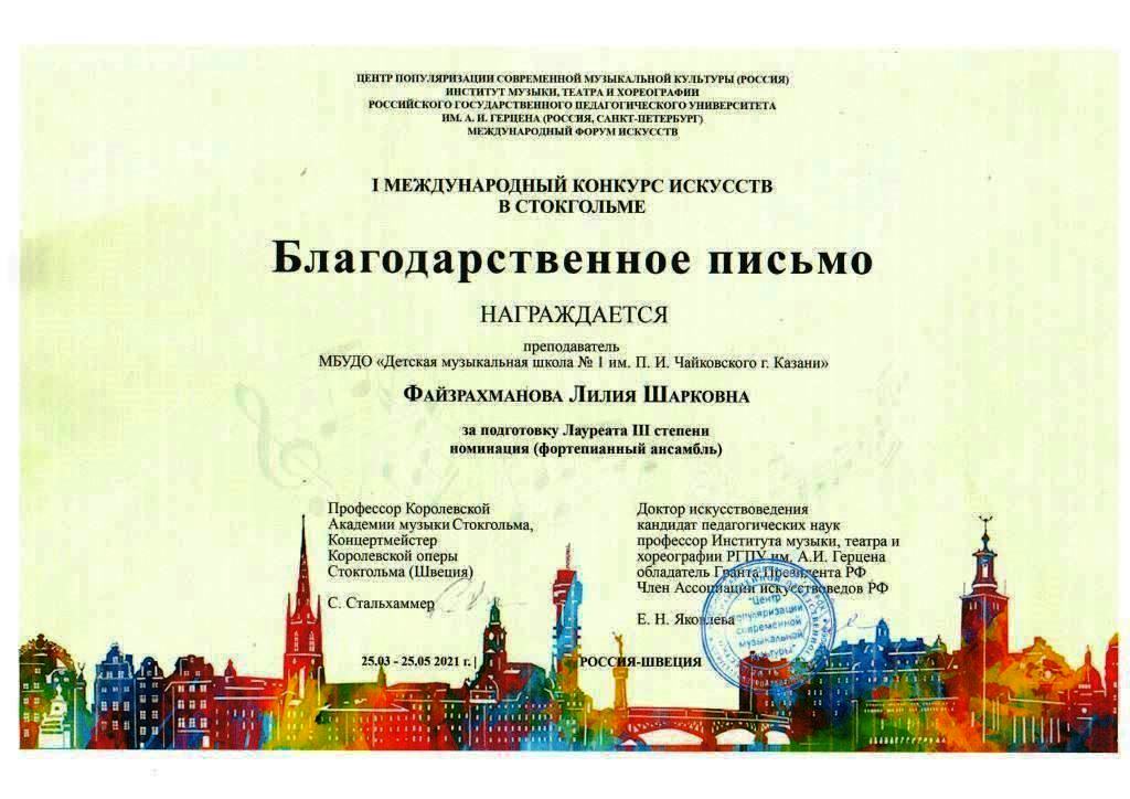 I Международный конкурс искусств в Стокгольме - Благодарность Файзрахмановой Л.Ш.;