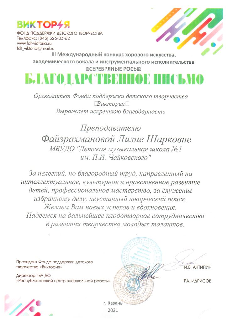 IV Международный конкурс пианистов "Моцарт XXI века" - Благодарность Файзрахмановой Л.Ш.;