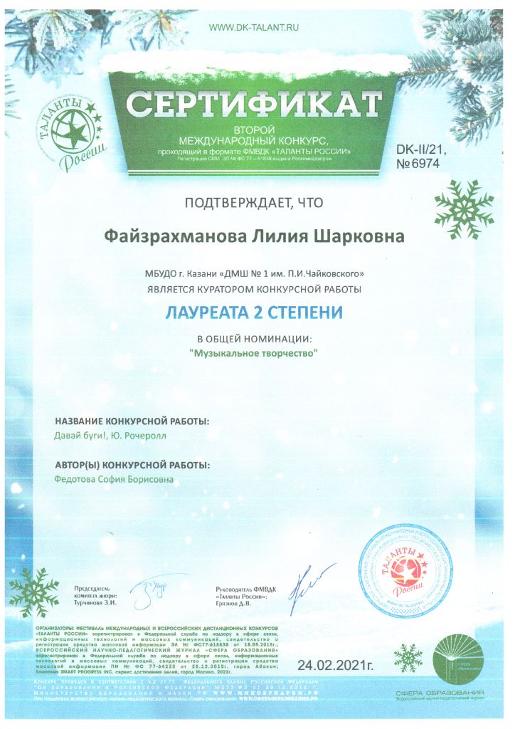 Второй международный конкурс "Таланты России" - Сертификат Файзрахмановой Л.Ш.;