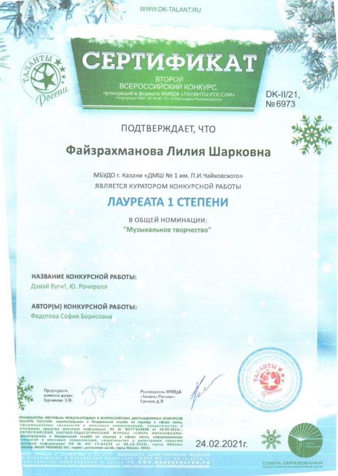 Второй всероссийский конкурс "Таланты России" - Сертификат Файзрахмановой Л.Ш.;