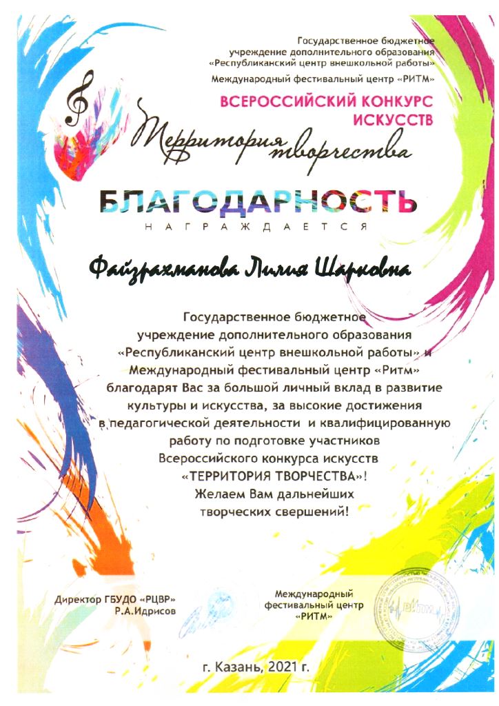 Всероссийский конкурс искусств "Территория творчества" - Благодарность Файзрахмановой Л.Ш.;