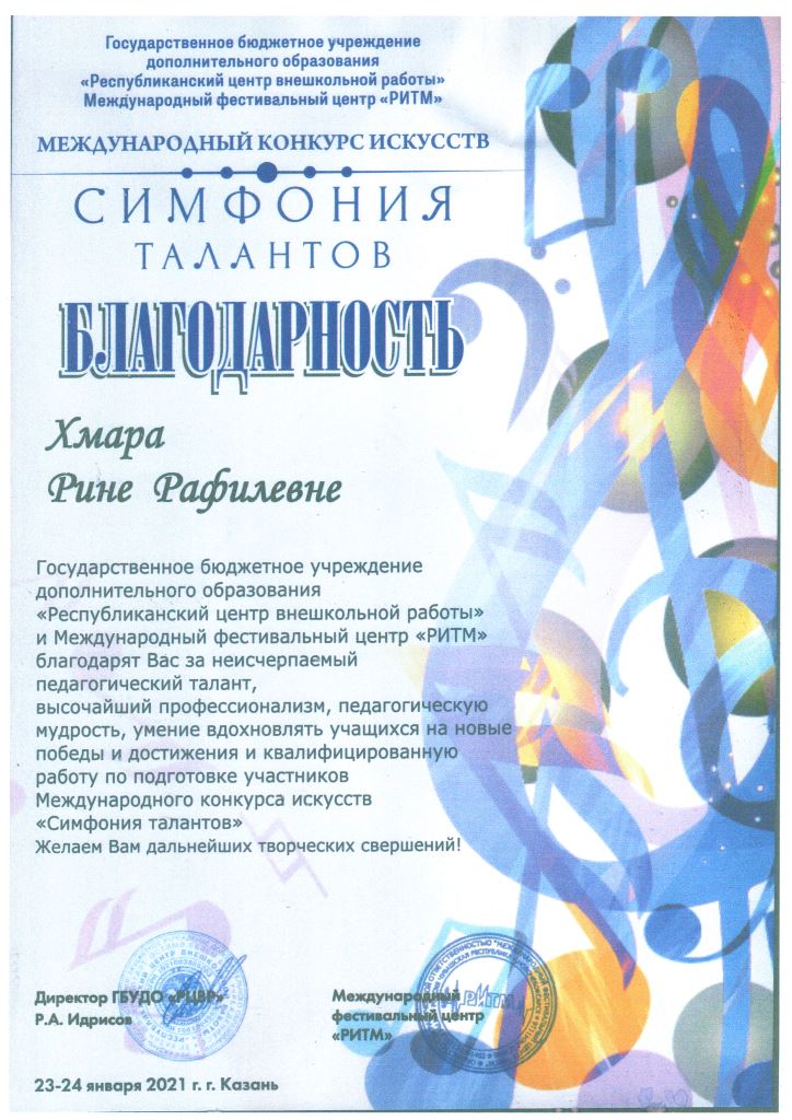 Международный конкурс искусств "Симфония талантов" - Благодарность Хмаре Р.Р.;