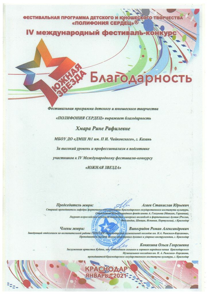 IV Международный фестиваль-конкурс "Южная звезда" - Благодарность Хмаре Р.Р.;