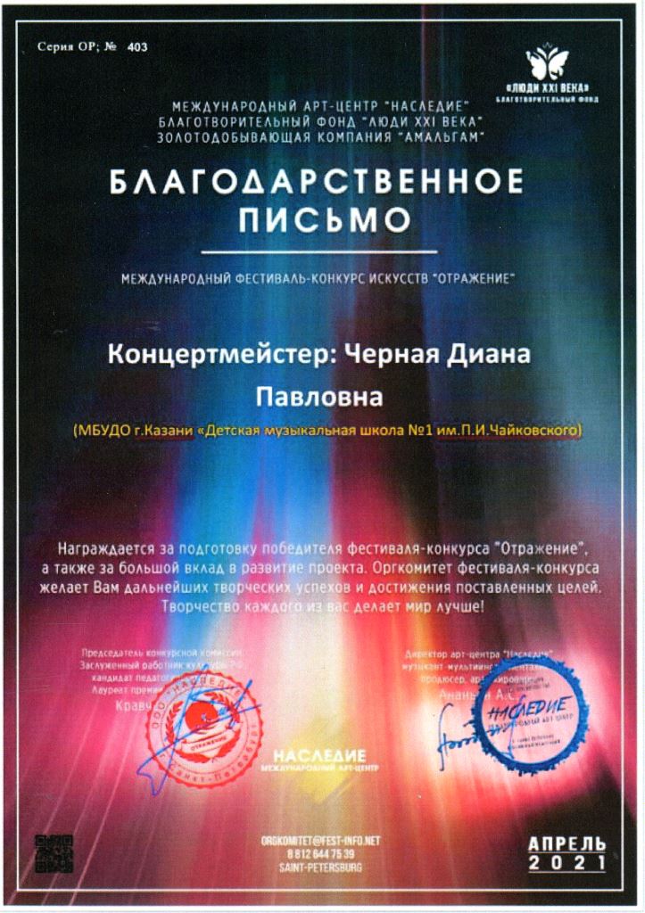 Международный фестиваль-конкурс искусств "Отражение" - Благодарность Черной Д.П.;