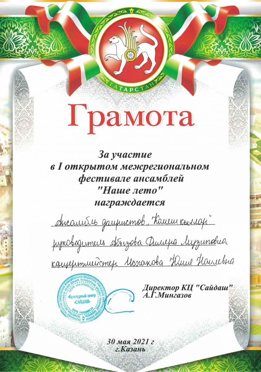 I Открытый межрегиональный фестиваль фестиваль ансамблей "Наше лето" - Ансамбль "Сокол", Грамота, рук. Тимофеев И.Р.;