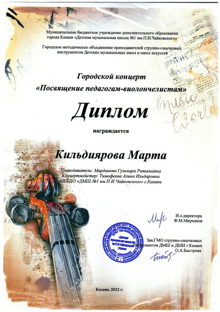 Городской концерт "Посвящение педагогам-виолончелистам" - Кильдиярова Марта, класс Мардановой Г.Р., концертмейстер Тимофеева А.И.;