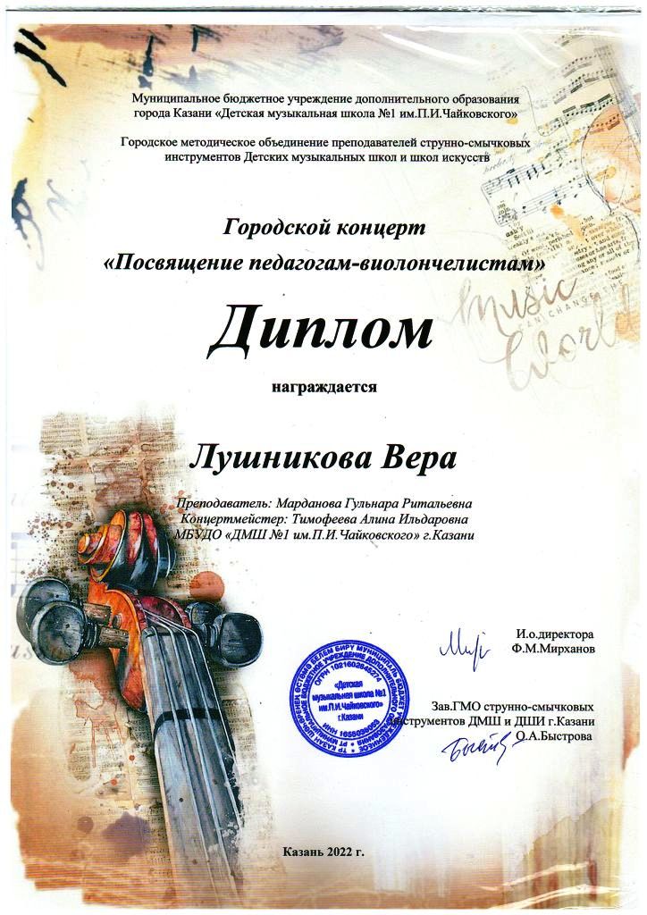 Городской концерт "Посвящение педагогам-виолончелистам" - Лушникова Вера, класс Мардановой Г.Р., концертмейстер Тимофеева А.И.;