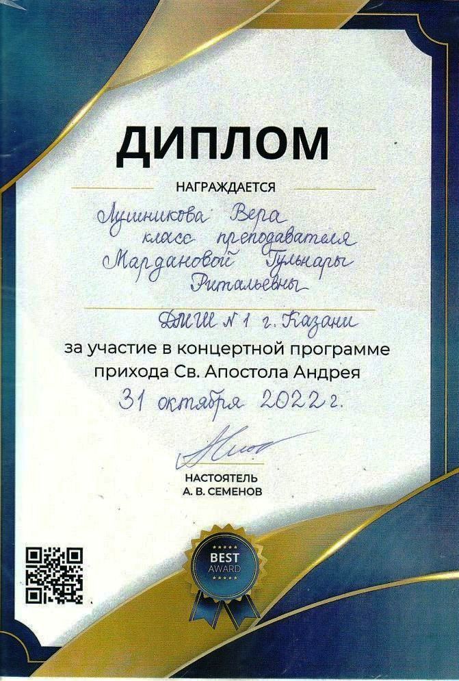 Участие в концертной программе прихода св. Апостола Андрея - Лушникова Вера, класс Мардановой Г.Р., концертмейстер Тимофеева А.И.;