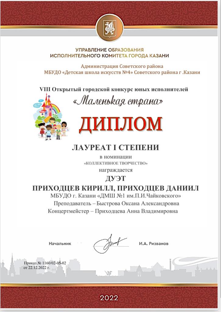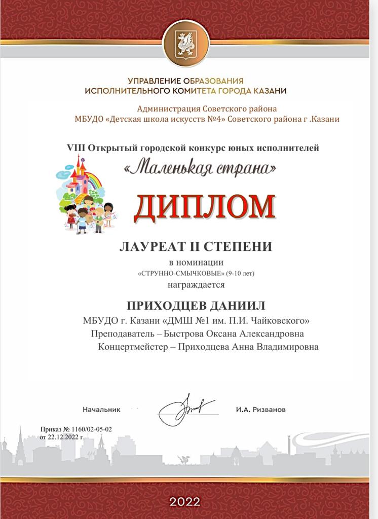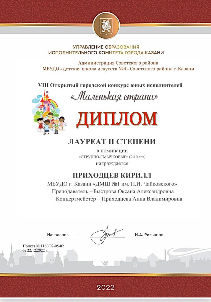 VIII Открытый городской конкурс юных исполнителей "Маленькая страна" - Приходцев К., Лауреат II степени, класс Быстровой О.А.;