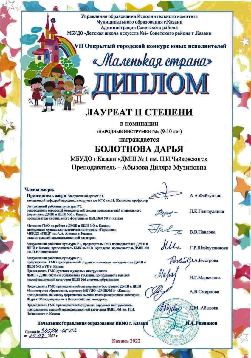 VII Открытый городской конкурс юных исполнителей "Маленькая страна" - Болотнова Дарья, Лауреат II степени, класс Абызовой Д.М.;