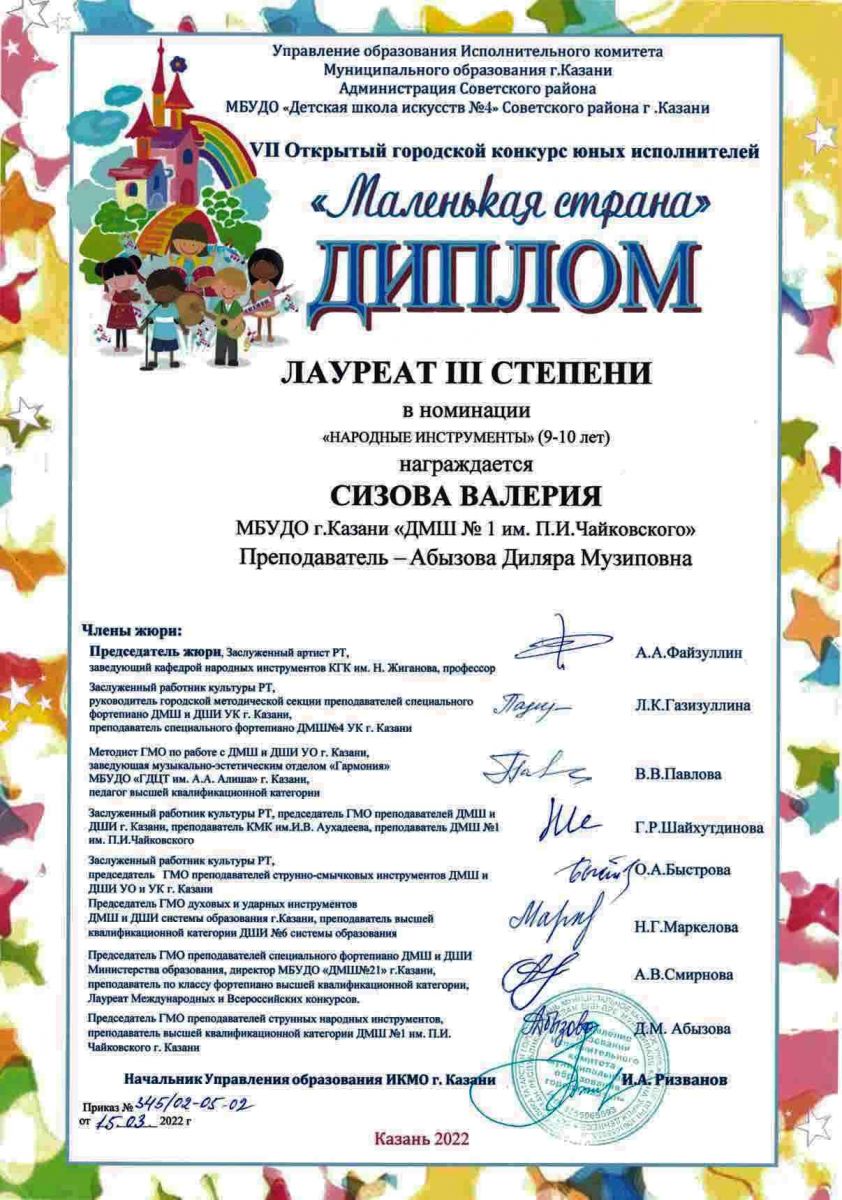 VII Открытый городской конкурс юных исполнителей "Маленькая страна" - Сизова Валерия, Лауреат III степени, класс Абызовой Д.М.;