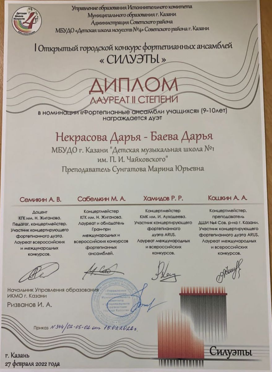 I Открытый городской конкурс фортепианных ансамблей "Силуэты" - Некрасова Дарья, Баева Дарья, Лауреаты II степени, класс Сунгатовой М.Ю.;