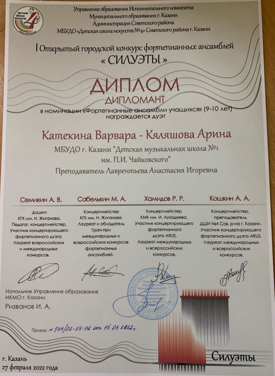 I Открытый городской конкурс фортепианных ансамблей "Силуэты" - Катекина Варвара, Кяляшова Арина, Дипломанты, класс Лаврентьевой А.И.;