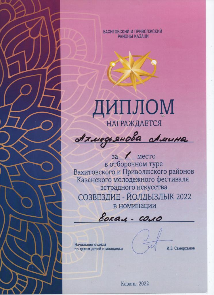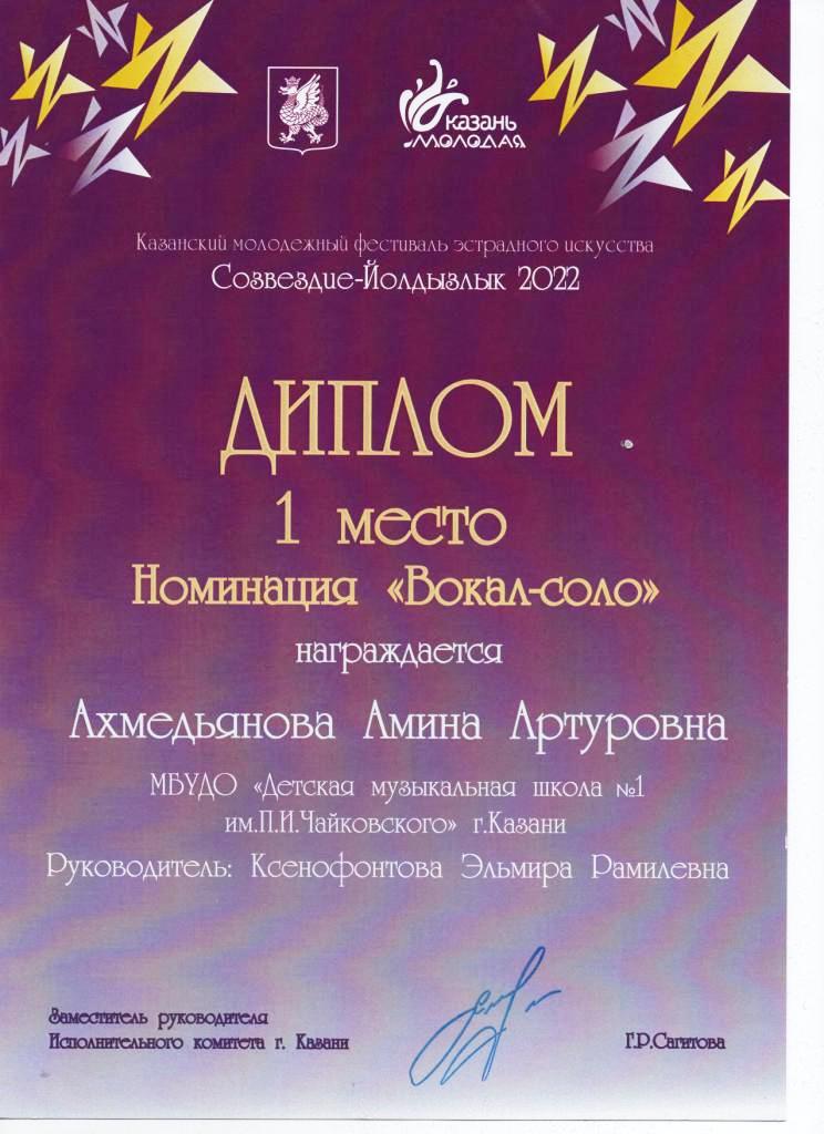 Казанский молодёжный фестиваль эстрадного искусства "Созвездие-Йолдызлык-2022" - Ахмедьянова Амина, Лауреат I степени;