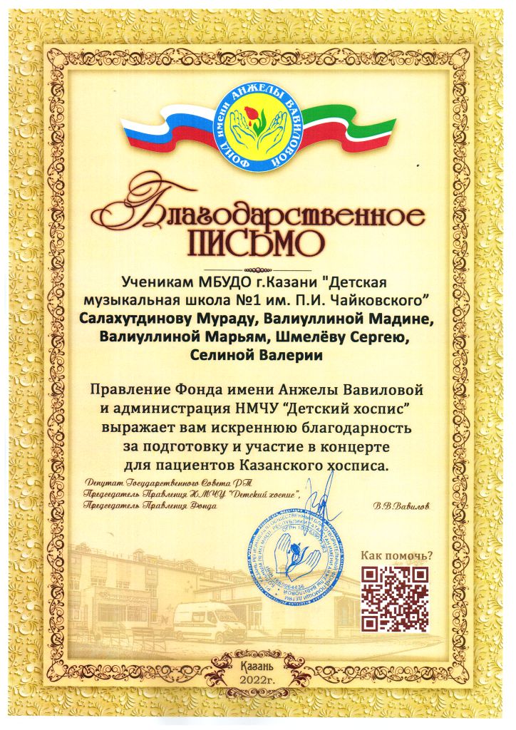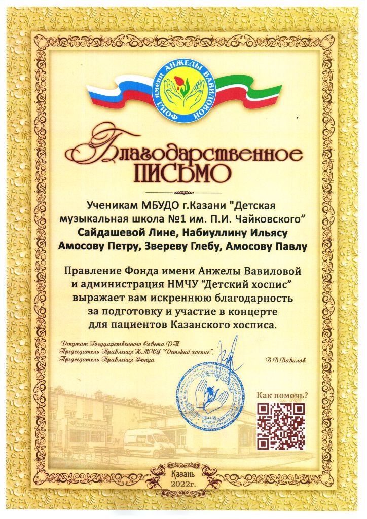 Правление Фонда имени Анжелы Вавиловой и администрация НМЧУ "Детский хоспис" - Благодарность Сайдашевой Л., Набиуллину И., Звереву Г., Амосовым Петру и Павлу;