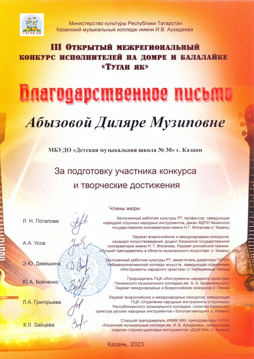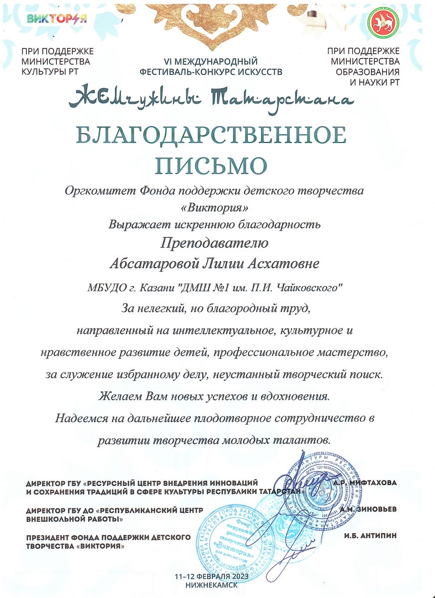 IV Международный фестиваль-конкурс искусств "Жемчужины Татарстана" - Благодарность Абсатаровой Л.А.;