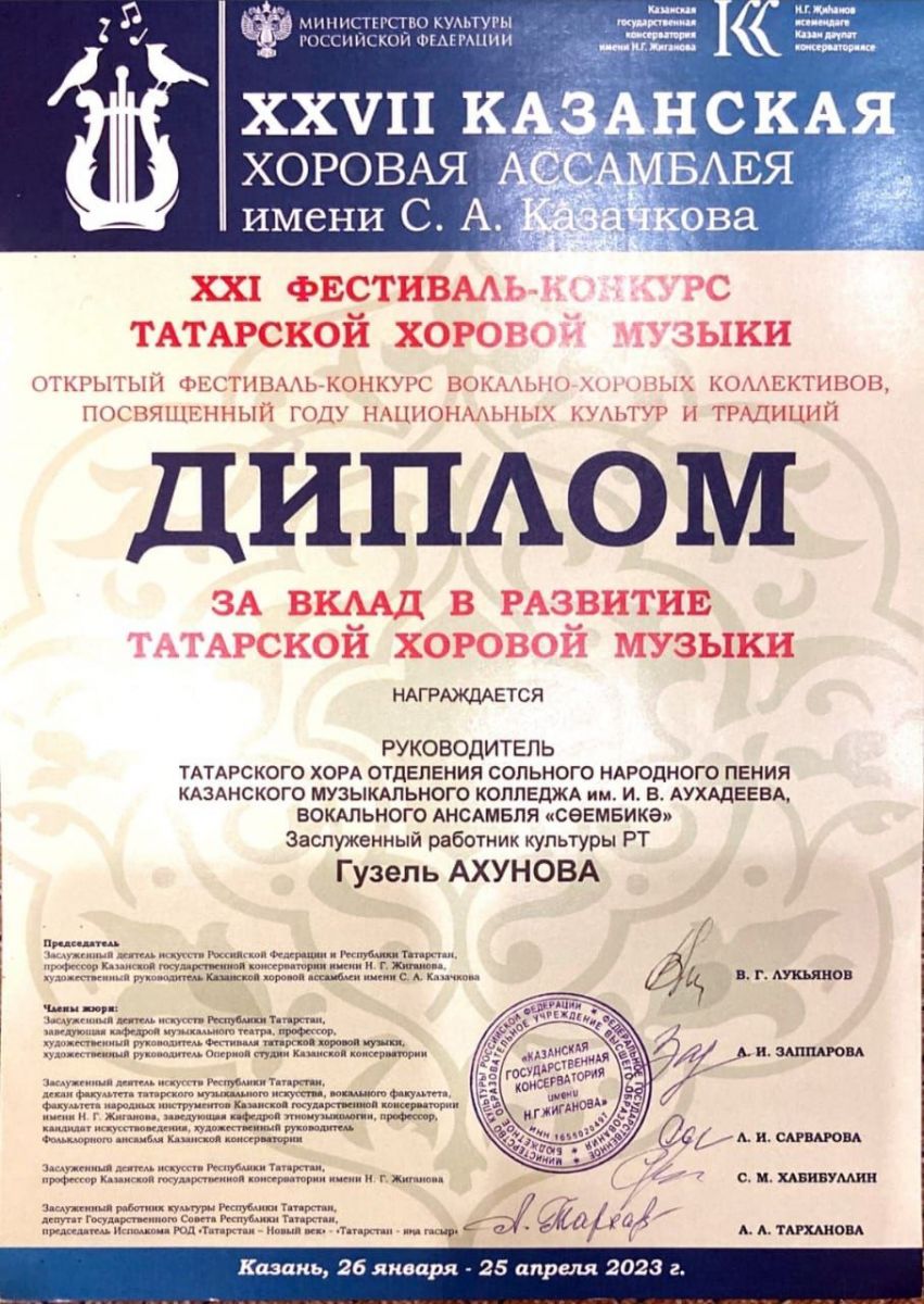 Всероссийский вокальный конкурс-фестиваль "Ансамбли России" - Благодарность Ахуновой Г.А.;