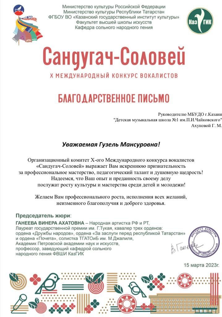 Х Международный конкурс вокалистов "Сандугач-Соловей" - Благодарность Ахуновой Г.М.;
