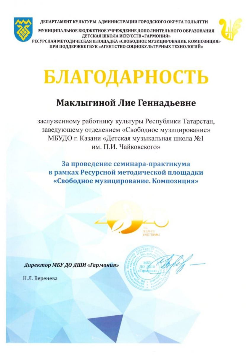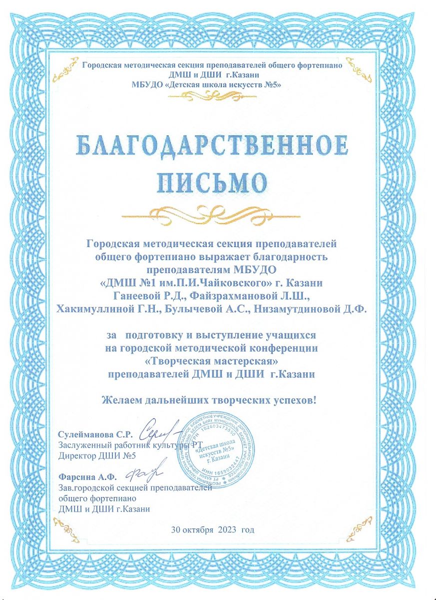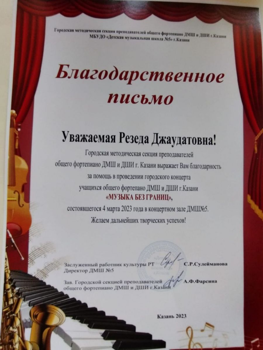 Городская методическая секция преподавателей общего фортепиано - Благодарность Ганиевой Р.Д.;