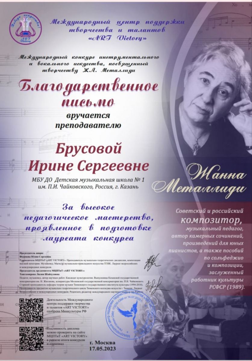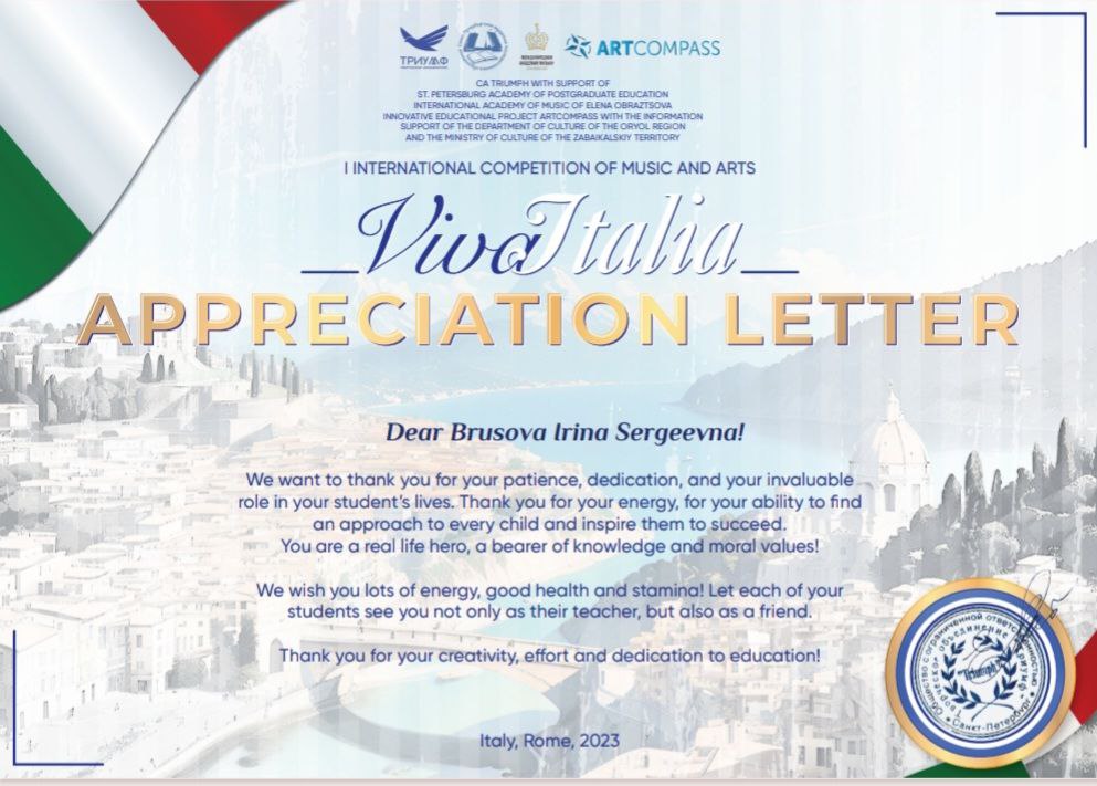 I Международный конкурс музыки и искусств "Viva Italia" - Благодарность Брусовой И.С.;