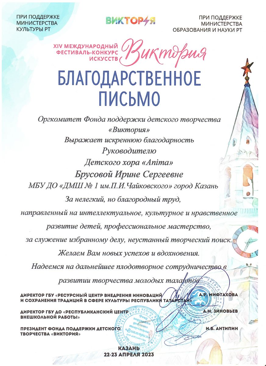 XIV Международный фестиваль-конкурс искусств "Виктория" - Благодарность Брусовой И.С.;