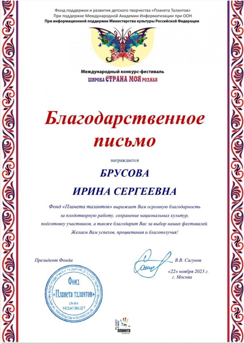 Международный конкурс-фестиваль "Широка страна моя родная" - Благодарность Брусовой И.С.;