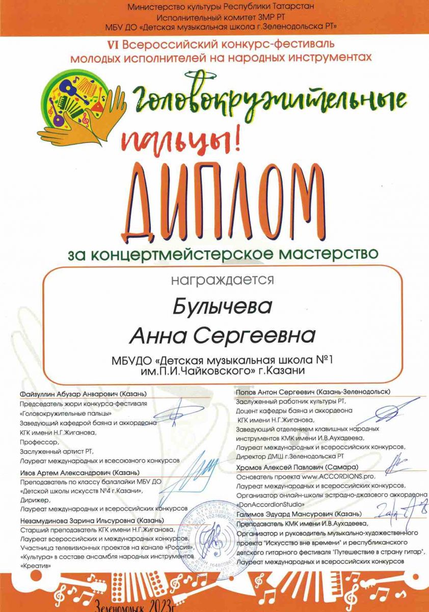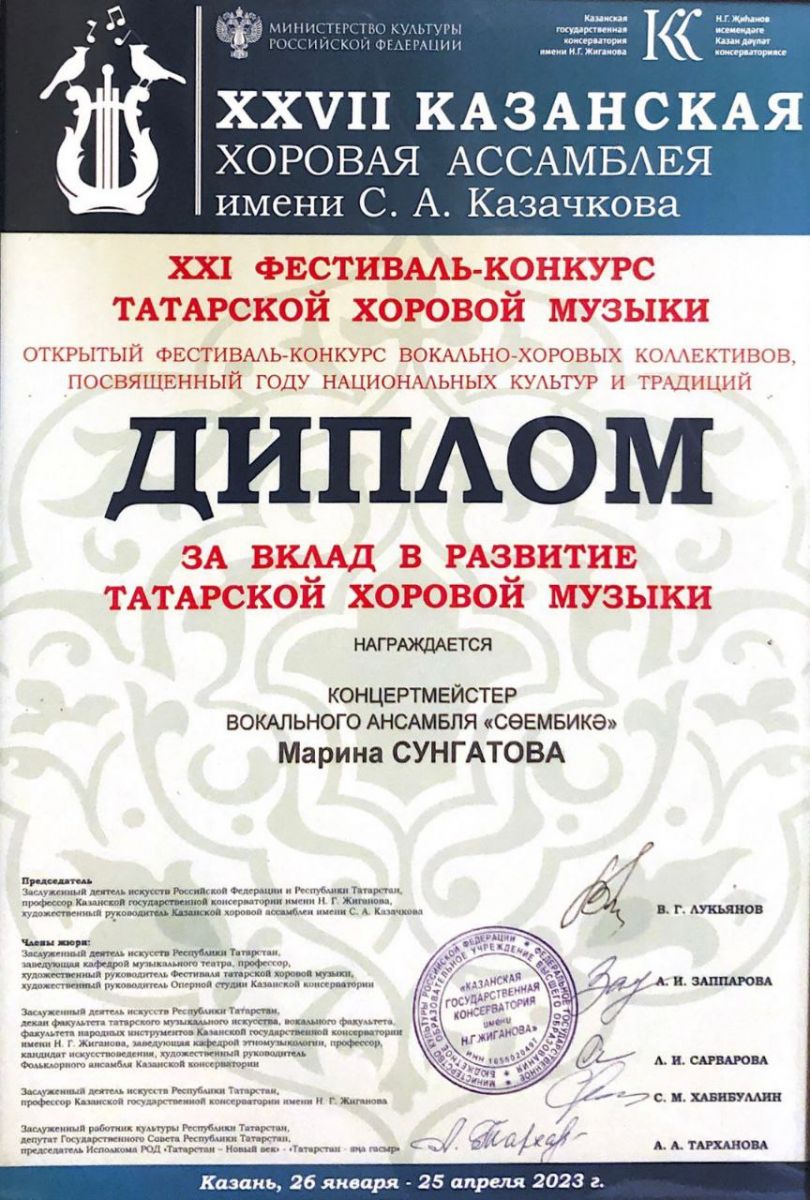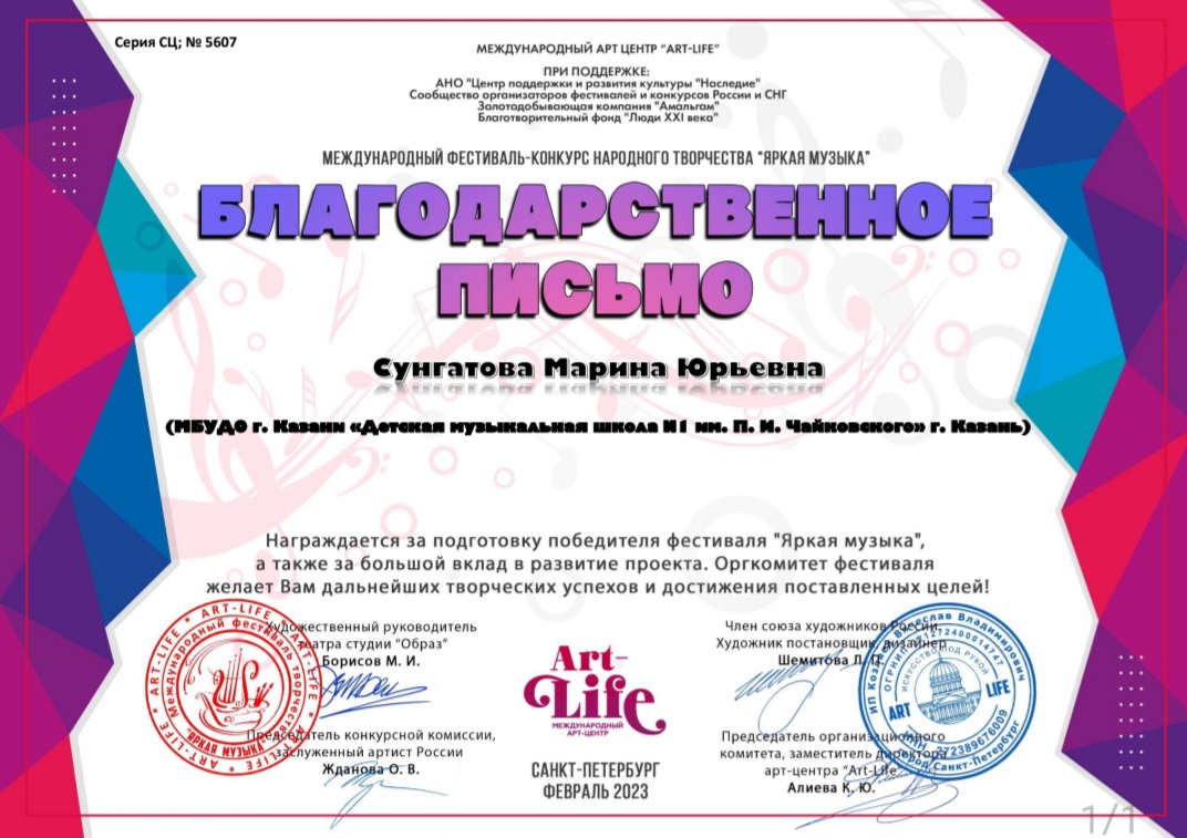 Международный фестиваль-конкурс народного творчества "Яркая музыка" - Благодарность Сунгатовой М.Ю.;
