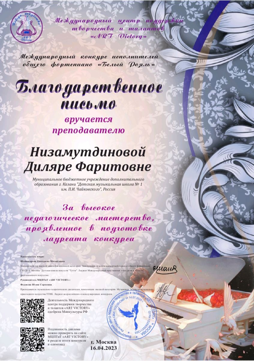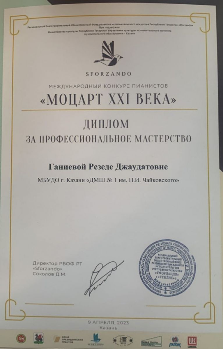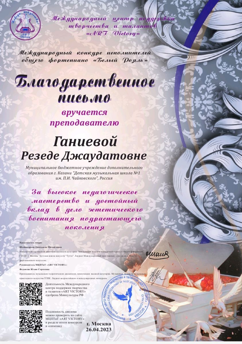 Международный конкурс исполнителей общего фортепиано "Белый рояль" - Благодарность Ганиевой Р.Д.;