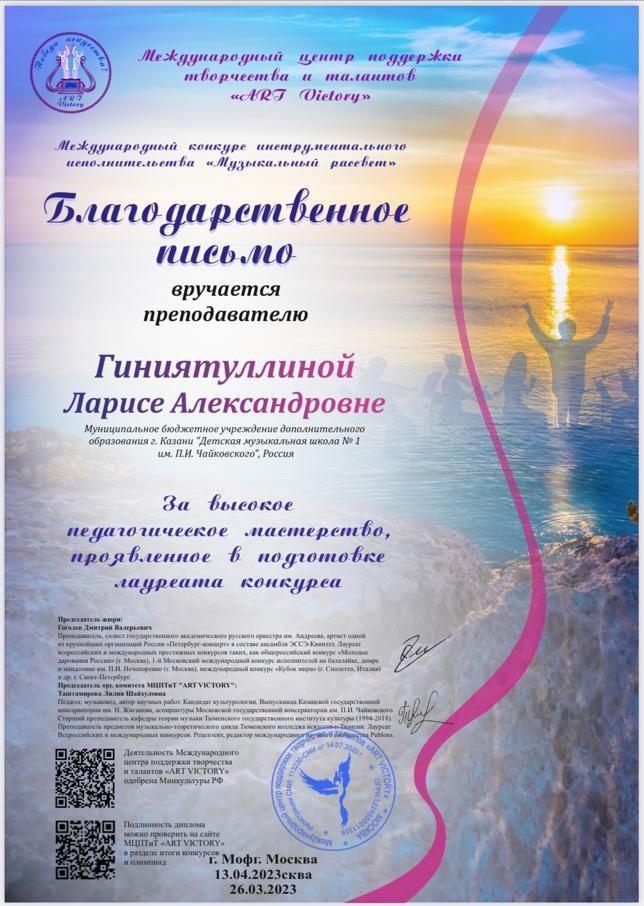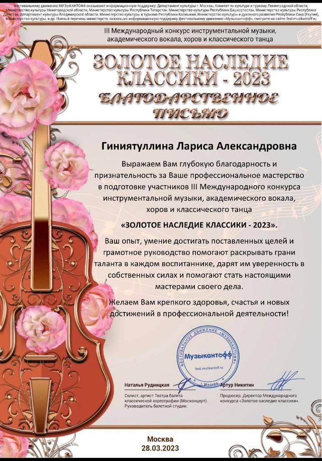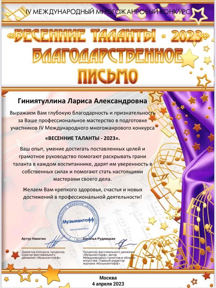 IV Международный многожанровый конкурс "Весенние таланты-2023" - Благодарность Гиниятуллиной Л.А.;