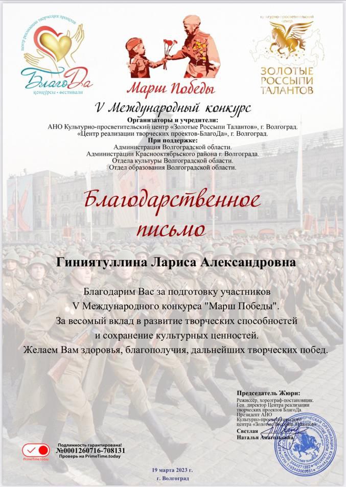 V Международный конкурс "Марш Победы" - Благодарность Гиниятуллиной Л.А.;