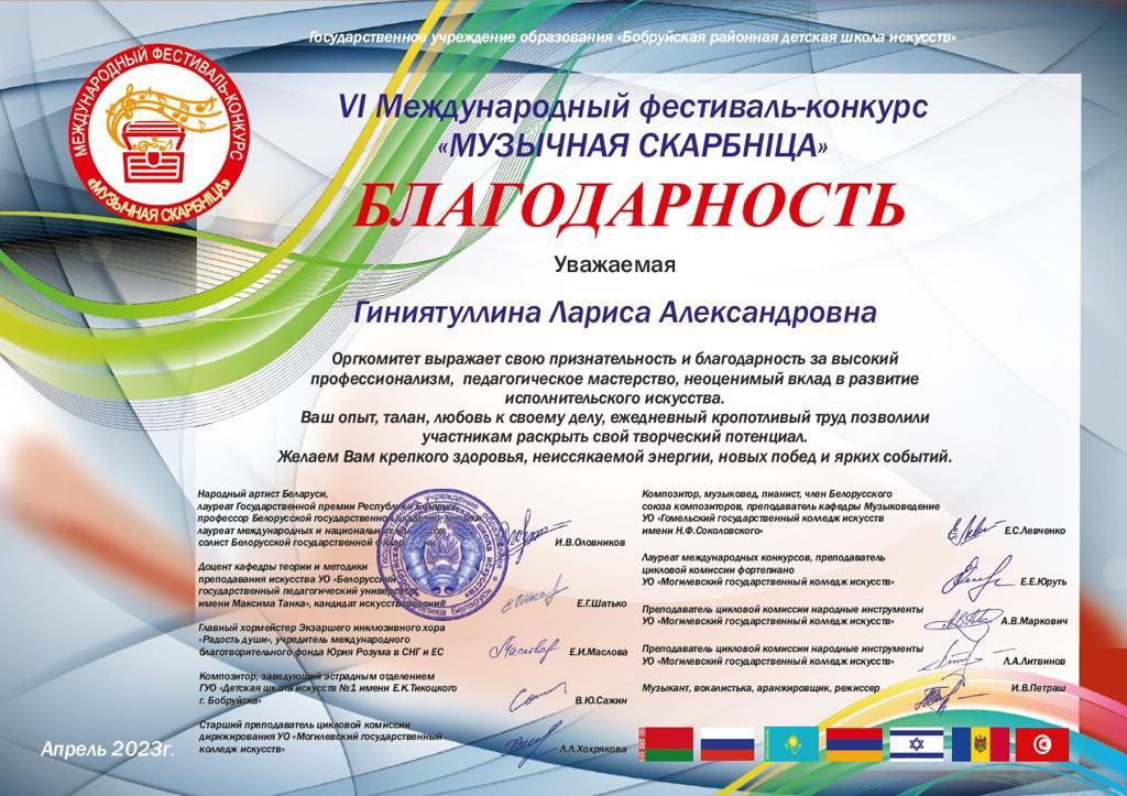 IV Международный фестиваль-конкурс "Музычная скарбнiца" - Благодарность Гиниятуллиной Л.А.;