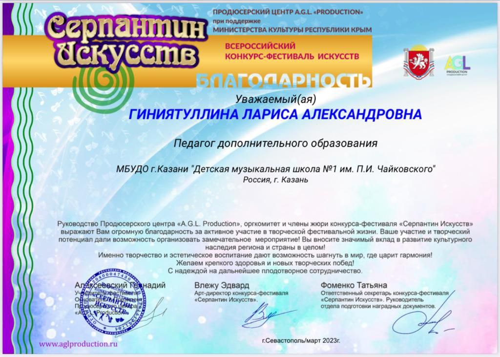Всероссийский конкурс-фестиваль искусств "Серпантин искусств" - Благодарность Гиниятуллиной Л.А.;