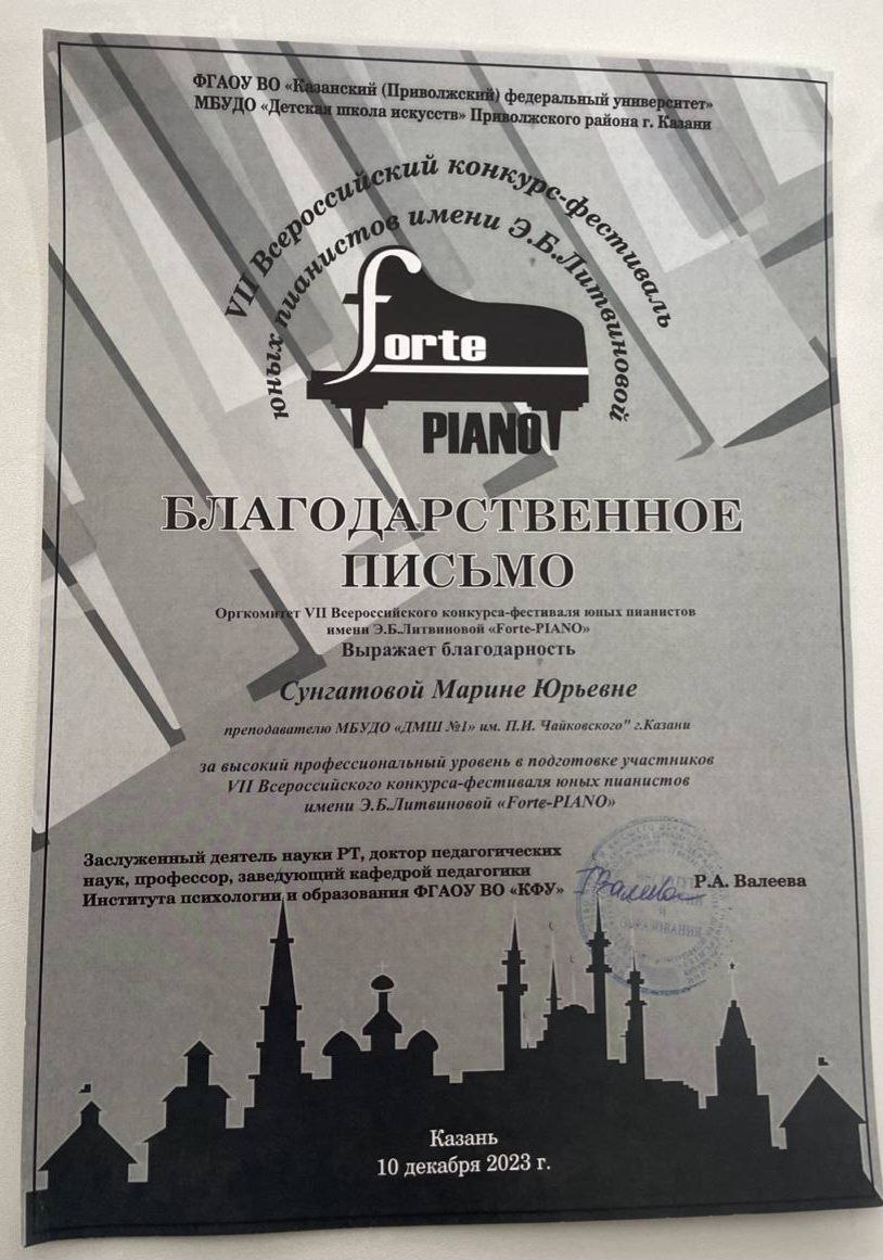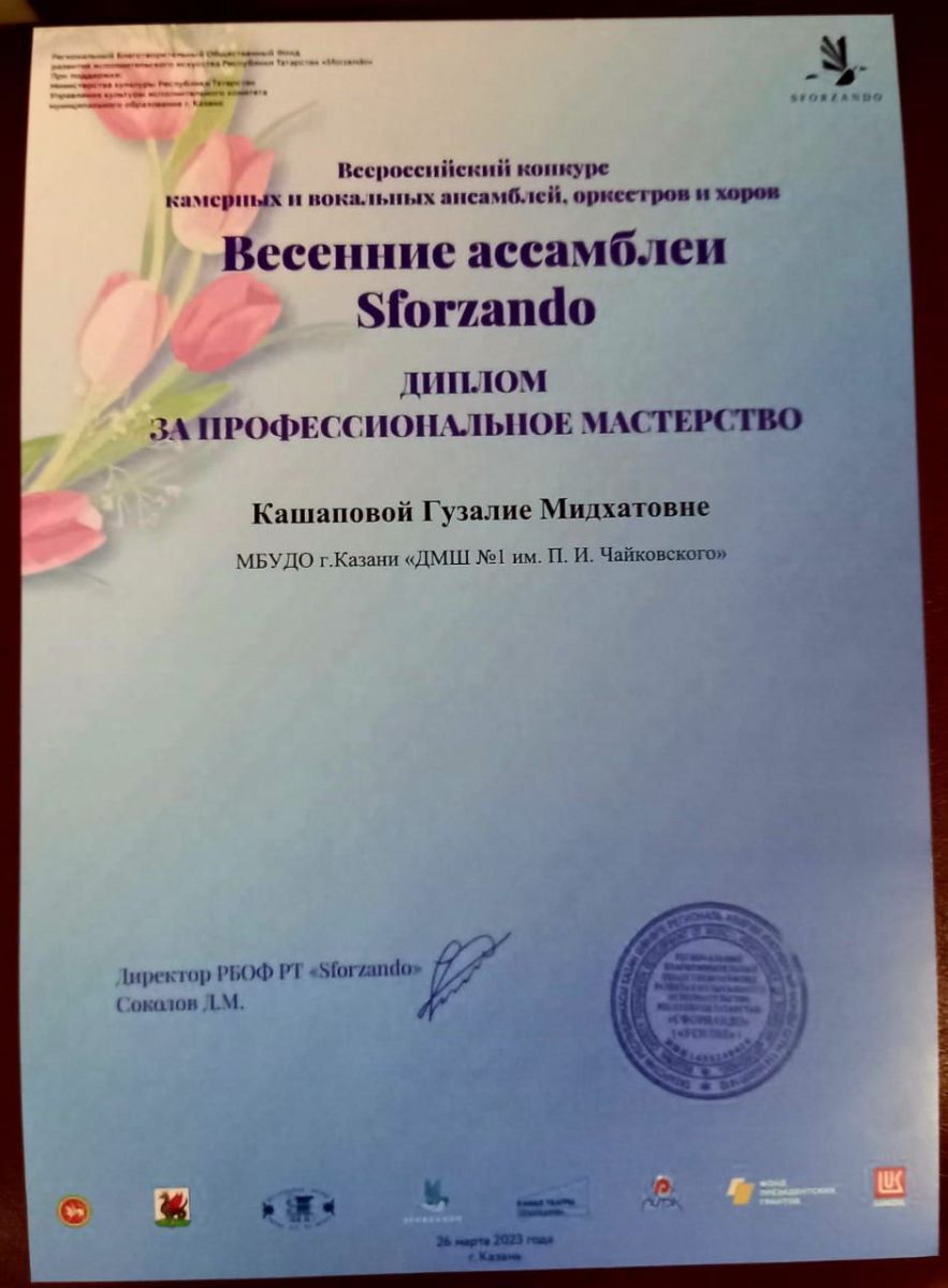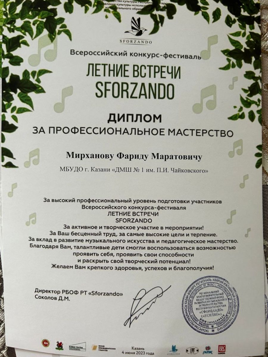Всероссийский конкурс-фестиваль "Летние встречи SFORZANDO" - Благодарность Мирханову Ф.М.;